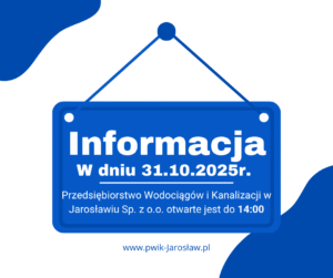 W dniu 31.10.2025r Przedsiębiorstwo Wodociągów i Kanalizacji w Jarosławiu Sp. z o.o. będzie otwarte do 14:00