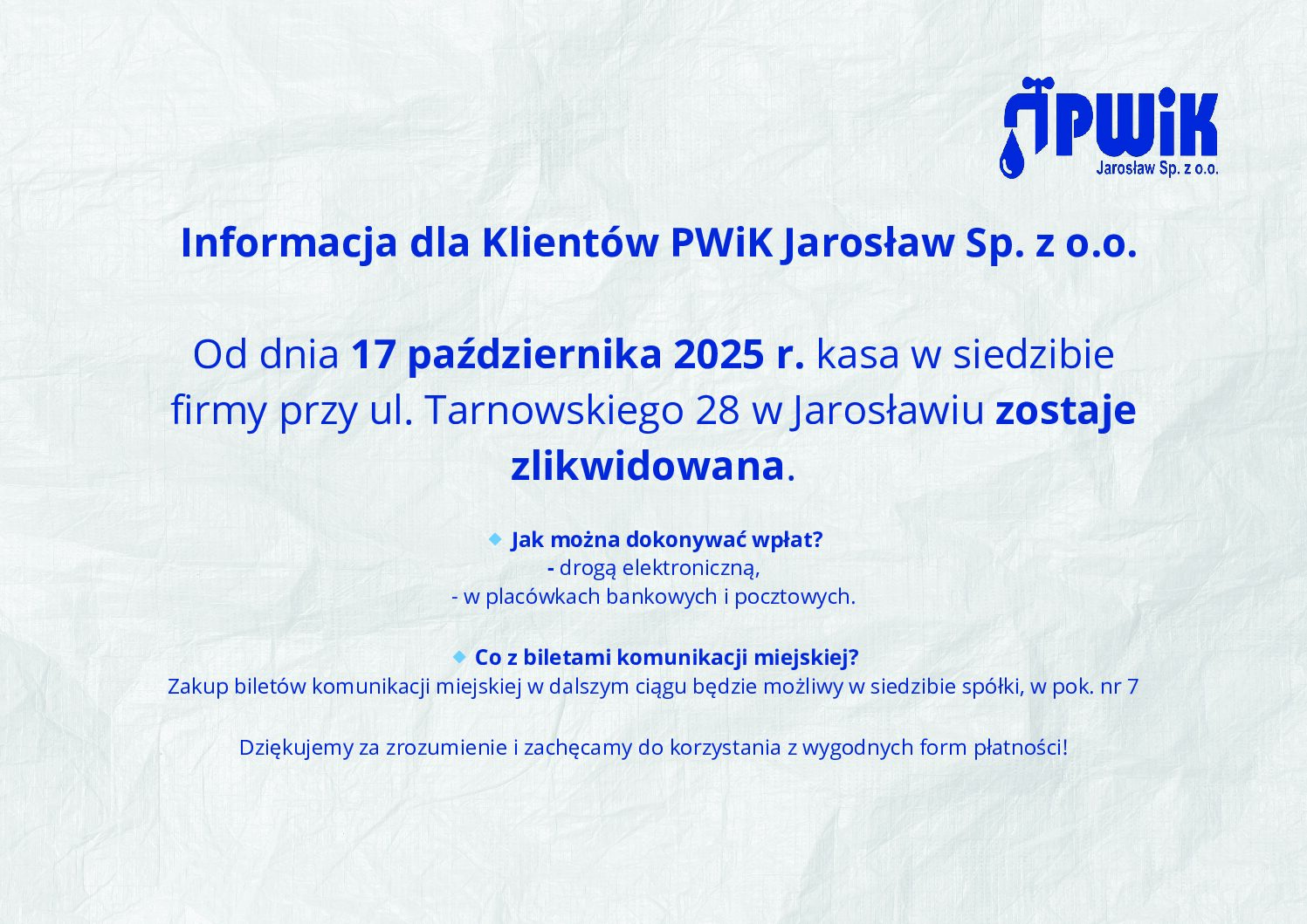 Od dnia 17 października 2025 r. kasa w siedzibie PWiK Sp. z o.o. przy ul. Tarnowskiego 28 w Jarosławiu zostaje zlikwidowana.